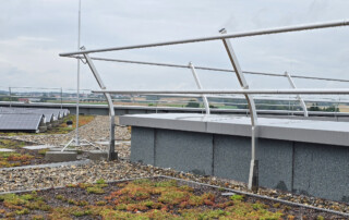Das Förderzentrum in Kösching setzt auf eine zukunftsweisende Verbindung von Klimaschutz und Energiegewinnung: Ein begrüntes Dach, kombiniert mit einer leistungsstarken Photovoltaikanlage, schafft sowohl ökologische als auch energetische Mehrwerte. Damit die notwendige Wartung und Pflege auf dem Dach jederzeit zuverlässig und gefahrlos durchgeführt werden können, entschied sich der Bauherr für die Absturzsicherung des Luxemburger Unternehmens LUX-top.