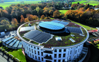 Das CIRCLE77 in Detmold ist ein modernes Büro- und Verwaltungsgebäude der AÜG Netzwerk GmbH. Es umfasst rund 3.300 m² Nutzfläche auf drei Etagen. Dazu gehören neben den modernen Büroräumen auch Workspaces zum gemeinsamen Arbeiten, Schulungs- und Konferenzräume, ein Fitnessbereich sowie eine große Gartenanlage mit Pavillon. Seine kreisförmige Architektur mit zentralem Atrium schafft helle Kommunikationsbereiche und flexible Arbeitsräume. Im Inneren wie auch außen spielt das Thema Nachhaltigkeit eine wichtige Rolle. So wurde ein Großteil des flach geneigten Dachs mit extensiver Begrünung versehen, die Zambelli in Zusammenarbeit mit Partnern umgesetzt hat. Das darunter befindliche RIB-ROOF-Metalldach übernimmt dabei mehrere Funktionen zugleich.