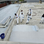 Die Arbeiten erfolgten in enger Abstimmung zwischen dem ausführenden Xcellence Partner, Wählen GmbH aus Aachen, dem Triflex Außendienst und der Anwendungstechnik. Zunächst wurden die Dachflächen grob gereinigt und Feuchtigkeit entfernt. Anschließend erfolgte die Reinigung der Dachbahnen und Anschlüsse mit Triflex Reiniger. Nach dem Ablüften konnte das Abdichtungssystem mit der Sprüh-Applikationsmaschine Triflex SAM maschinell aufgebracht werden. Die Details wurden parallel händisch mit Triflex ProDetail ausgeführt.