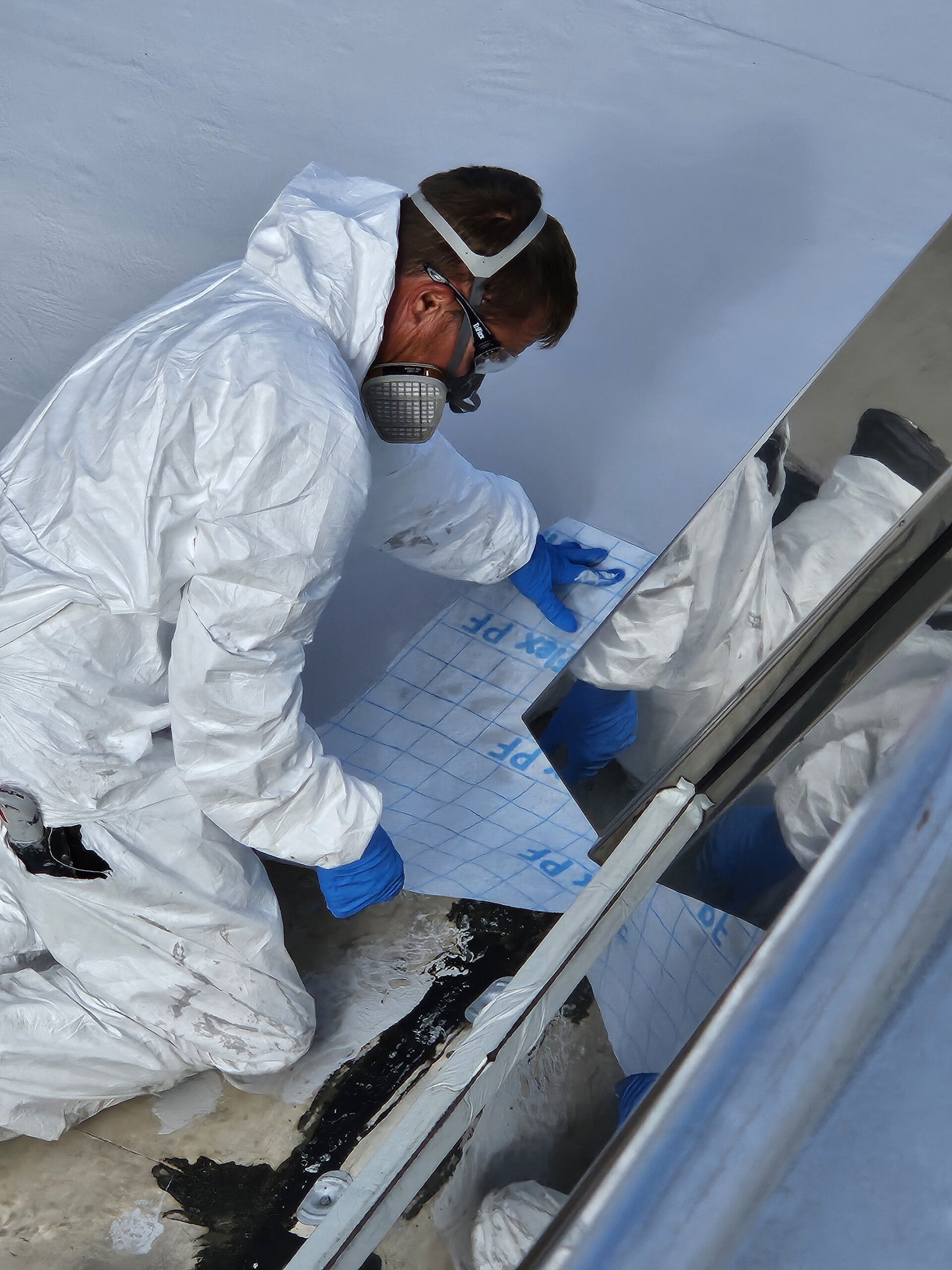 Das Projekt umfasste die Sanierung mehrerer zusammenhängender Flachdächer mit insgesamt rund 2.000 m² Fläche. „Die unterschiedlichen Hallenhöhen, Dachgrößen zwischen 200 und 900 m² und eine fest zugeteilte Baustelleneinrichtung erschwerten die Umsetzung. Betriebswege mussten jederzeit frei bleiben, ein Gerüst konnte nicht gestellt werden. Zusätzlich erschwerten Hagelschäden, durchfeuchtete Dachbahnen und offene Nähte infolge von Weichmacherwanderung die Ausgangslage“, weiß Joachim Meurer, Gebietsverkaufsleiter bei Triflex. Gefordert war eine schnelle, sichere und nahtlose Abdichtung, die hydrolysebeständig, UV- und witterungsresistent ist und die Innenräume langfristig vor Feuchtigkeit schützt.