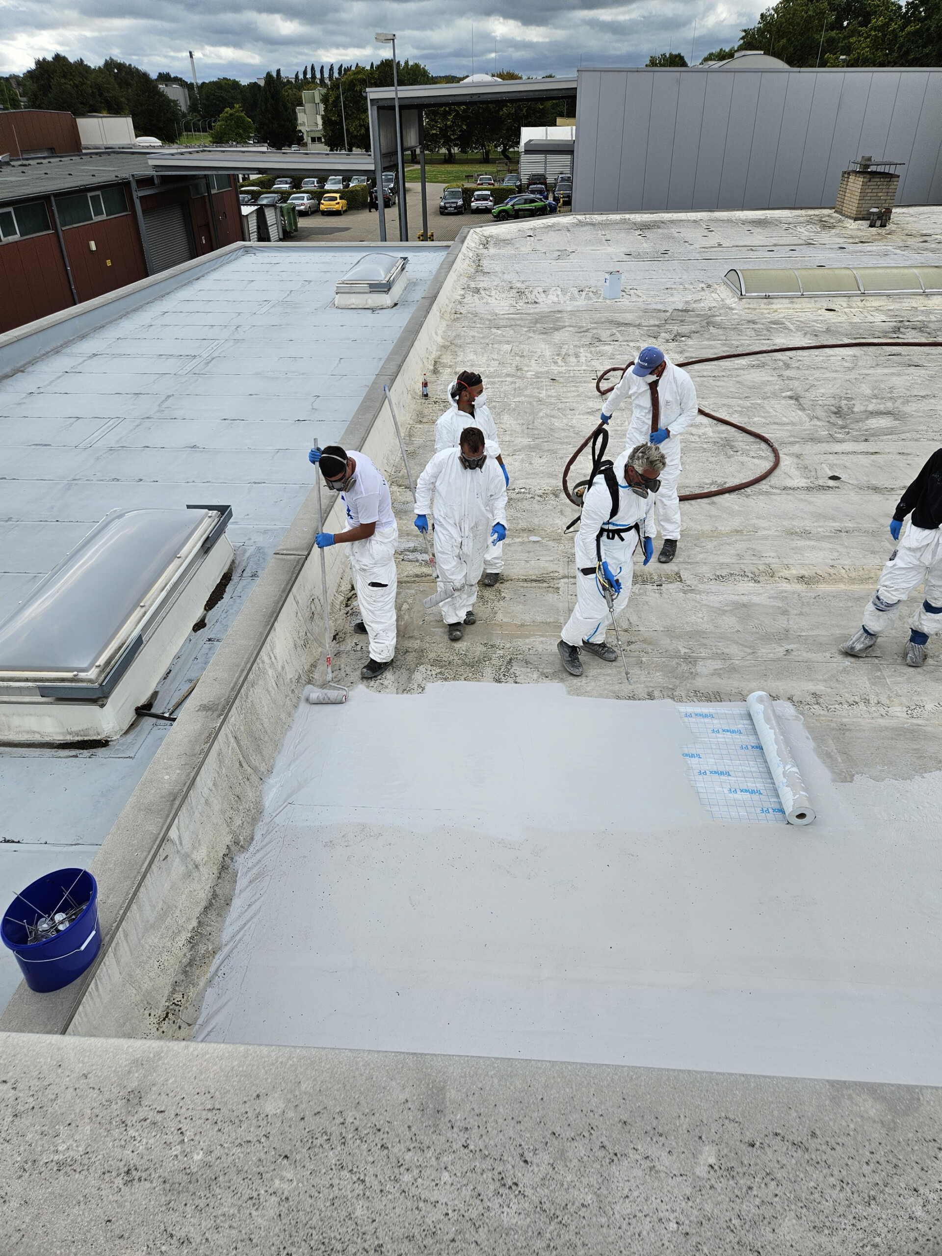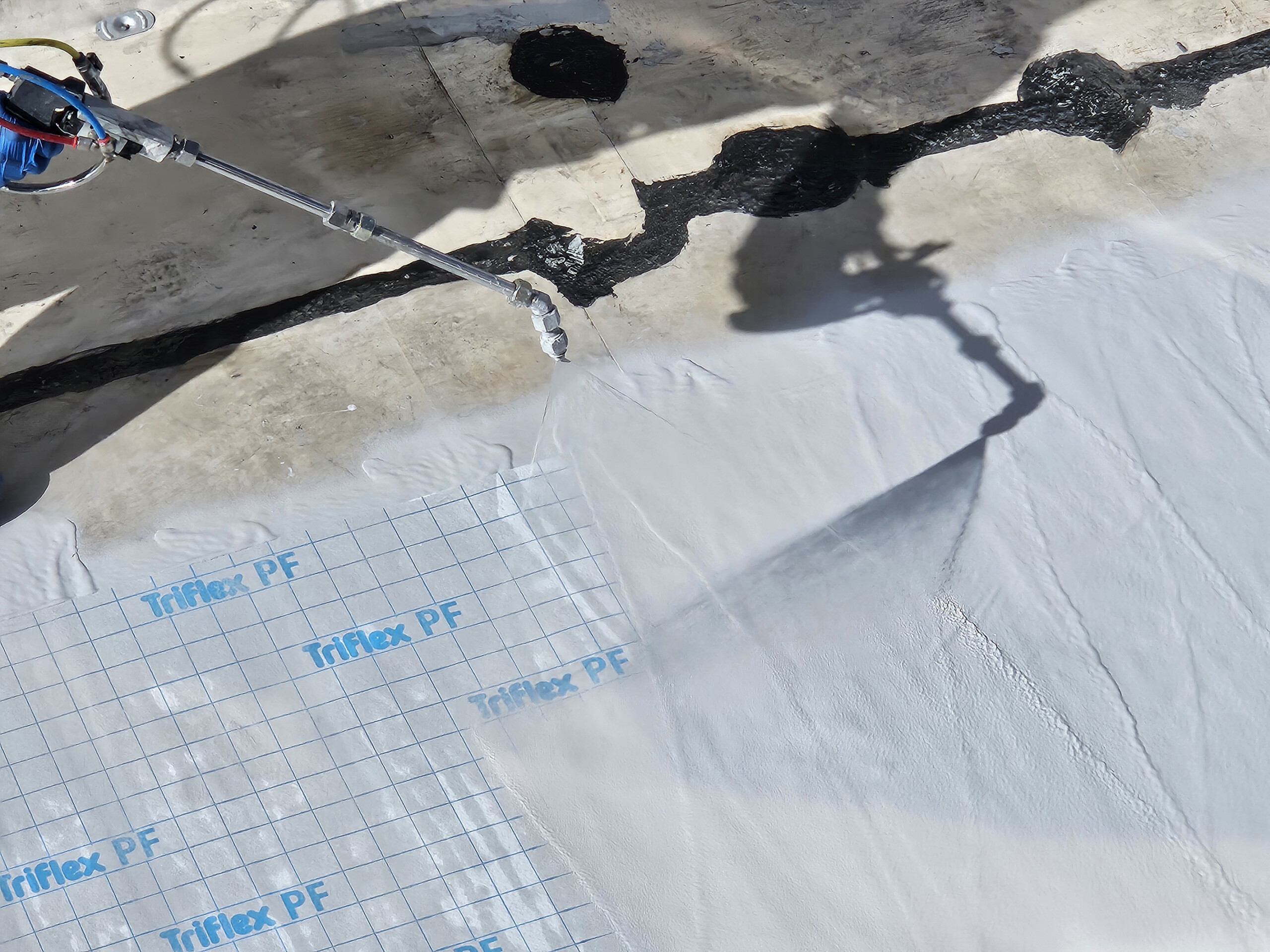 Die Arbeiten erfolgten in enger Abstimmung zwischen dem ausführenden Xcellence Partner, Wählen GmbH aus Aachen, dem Triflex Außendienst und der Anwendungstechnik. Zunächst wurden die Dachflächen grob gereinigt und Feuchtigkeit entfernt. Anschließend erfolgte die Reinigung der Dachbahnen und Anschlüsse mit Triflex Reiniger. Nach dem Ablüften konnte das Abdichtungssystem mit der Sprüh-Applikationsmaschine Triflex SAM maschinell aufgebracht werden. Die Details wurden parallel händisch mit Triflex ProDetail ausgeführt.