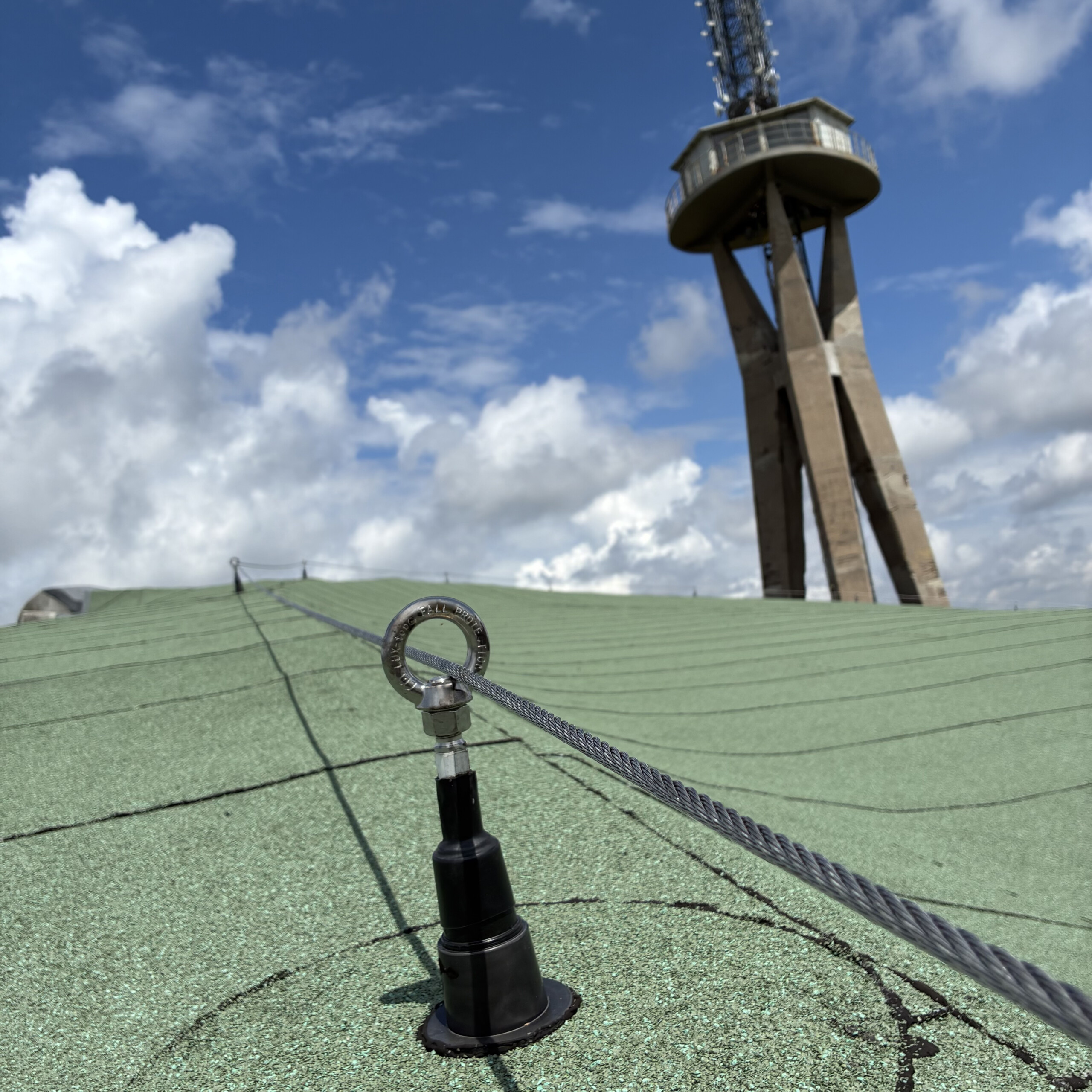 Eine der größten Herausforderungen stellte die geringe Tragfähigkeit der filigranen Dachschale dar: Punktlasten durften 0,75 kN nicht überschreiten, zudem war eine Zwischenlagerung von Material ausgeschlossen. Gemeinsam mit Planern und Denkmalbehörden entwickelte LUX-top deshalb eine individuelle Befestigungsmöglichkeit über den umlaufenden Ringanker des Daches. Das Resultat ist eine technisch ausgefeilte Lösung: Die 185 Meter lange Edelstahlseilanlage LUX-top FSE 2003, verankert an 33 Anschlagpunkten des Typs ASP EV2 zur Befestigung auf Beton, fügt sich harmonisch in die Architektur des Bauwerks ein. Um die Edelstahlseilanlage optimal an die geschwungene Dachform anzupassen, wurden die Abstände zwischen den Anschlagpunkten enger als üblich gesetzt.