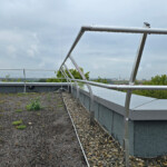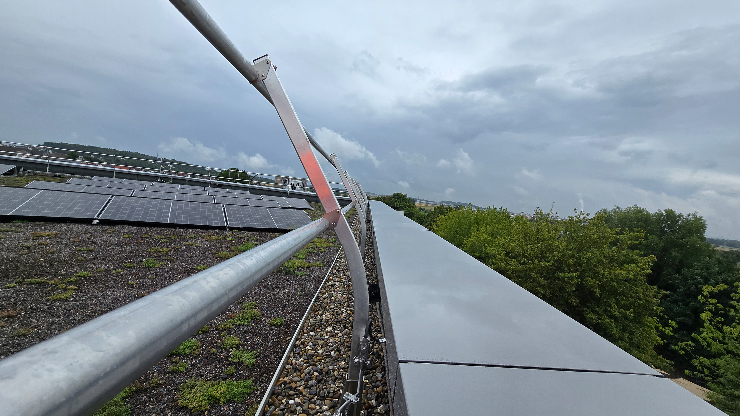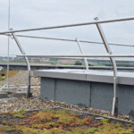 Die Montage begann an den Dachecken und wurde anschließend modular ergänzt. Dank weniger und passgenauer Werkzeuge und der einfachen Handhabung des Systems ließ sich die Installation rasch und zuverlässig umsetzen. Anstelle von Gegengewichten kam die speziell entwickelte LUX-top G-T HA green Schüttgutwanne zum Einsatz, die sich mittels Beschwerung durch Kies oder Substrat ideal für die Verwendung auf begrünten Dächern eignet. Vor allem die vormontierten Komponenten und das geringe Gewicht ermöglichten den zügigen Aufbau des 300 Meter langen Seitenschutzsystems.