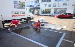 Der Tesla-Showroom in Leipzig ist als Präsentations- und Verkaufsstandort für Elektrofahrzeuge ein zentraler Anlaufpunkt für Kunden und sichtbares Aushängeschild der Marke. Der vorgelagerte Parkplatz wird als Verkaufs- und Stellfläche für die Elektro-Fahrzeuge genutzt. Nachdem es dort infolge von Vandalismus zu einem Brandschaden an abgestellten Fahrzeugen gekommen war, musste die ebenfalls beschädigte Asphaltfläche kurzfristig instandgesetzt werden. Zum Einsatz kam ein Produkt des Mindener Flüssigkunststoffspezialisten Triflex. Der Reparaturmörtel Triflex Asphalt Repro 3K thix auf Basis von Polymethylmethacrylat (PMMA) gibt der Fläche eine langanhaltende Widerstandsfähigkeit.