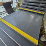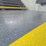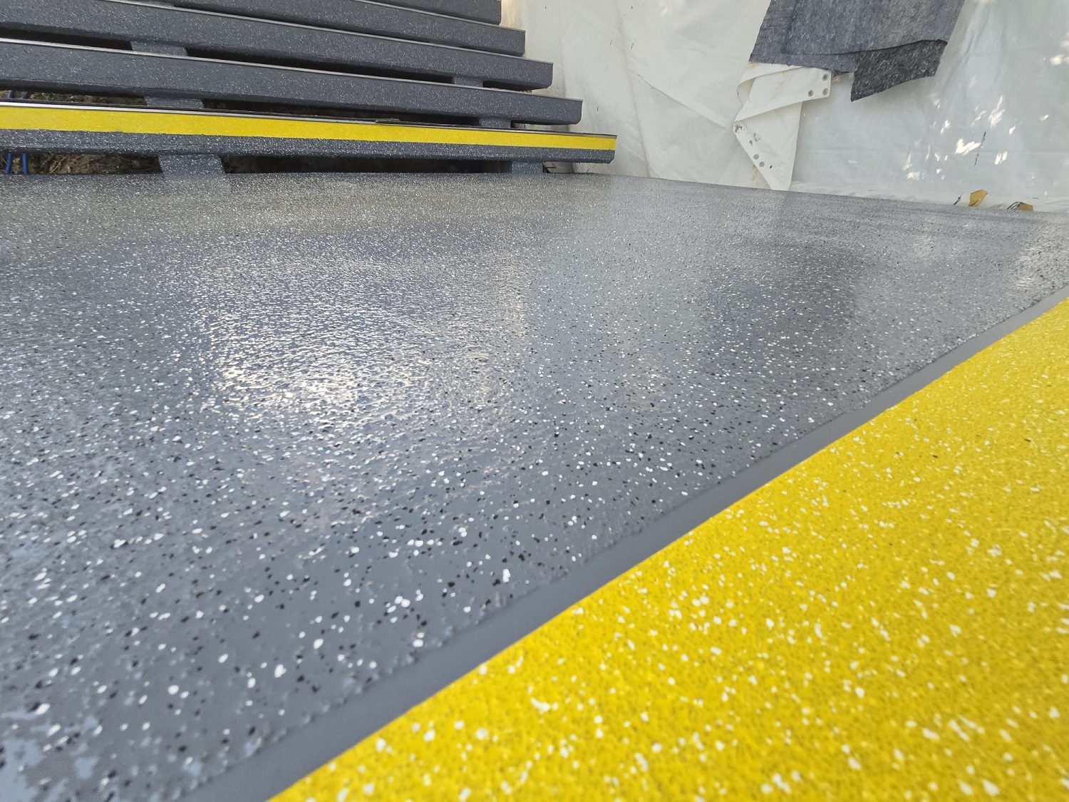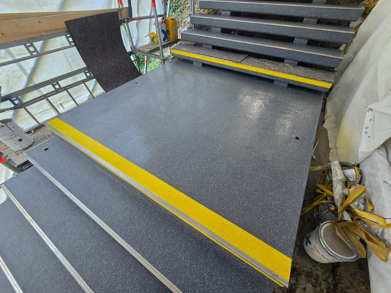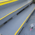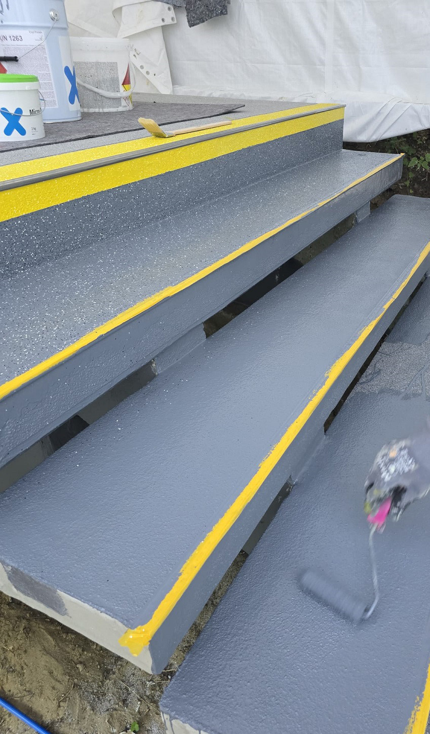 Im nächsten Schritt streuten die Arbeiter Quarzsand ein, um eine rutschhemmende und trittsichere Fläche in der Klasse R12 herzustellen. Die abschließende Versiegelung mit Triflex Cryl Finish 205 erfolgte in zwei Farbtönen. Um den Beginn der Treppenstufe zu signalisieren, wurde die Signalfarbe Gelb eingesetzt. Die kontrastreiche Gestaltung erleichtert die Wahrnehmung der Stufen und unterstützt Menschen mit Sehbeeinträchtigung.